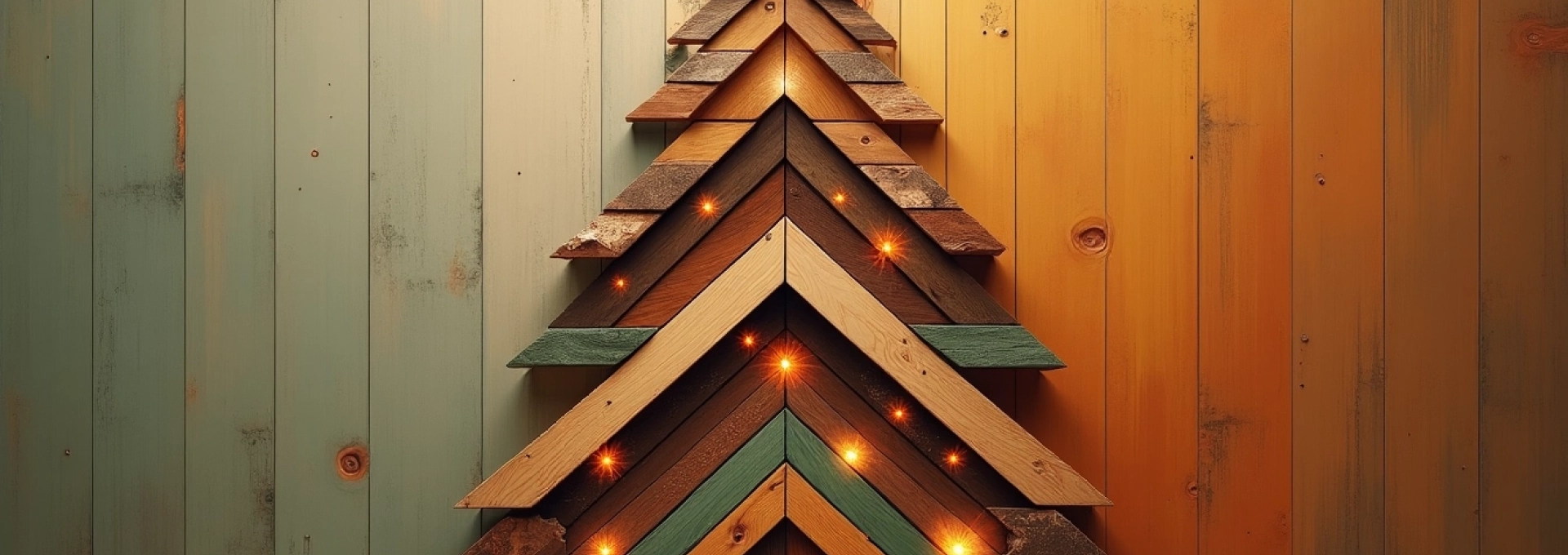 Pour une démarche encore plus respectueuse de l’environnement, construisez votre sapin à partir de tasseaux de bois recyclé. Récupérez des palettes ou des chutes de bois de chantier et transformez-les en tasseaux de tailles variées. L’aspect irrégulier et patiné du bois recyclé apportera un charme rustique à votre création. Complétez cette approche éco-responsable en décorant votre sapin avec des ornements naturels comme des pommes de pin, des tranches d’agrumes séchées, ou des étoiles en paille tressée.