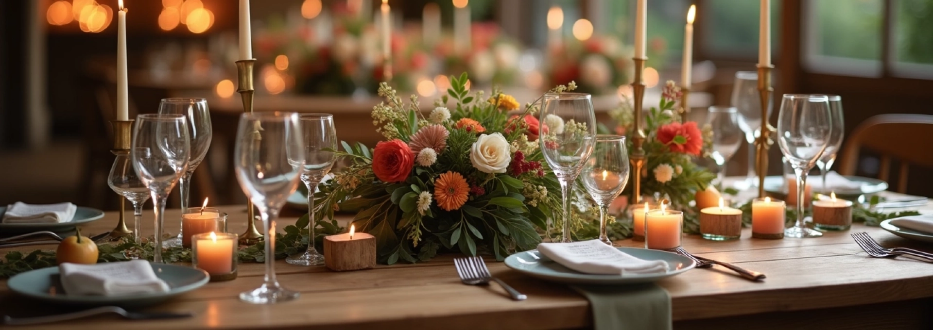Les centres de table sont l’occasion parfaite d’intégrer des éléments naturels locaux dans votre décoration. Créez des compositions florales basses dans des contenants rustiques comme des caisses en bois, des paniers en osier ou des arrosoirs vintage. Utilisez des fleurs de saison cueillies localement pour une approche écologique et authentique.