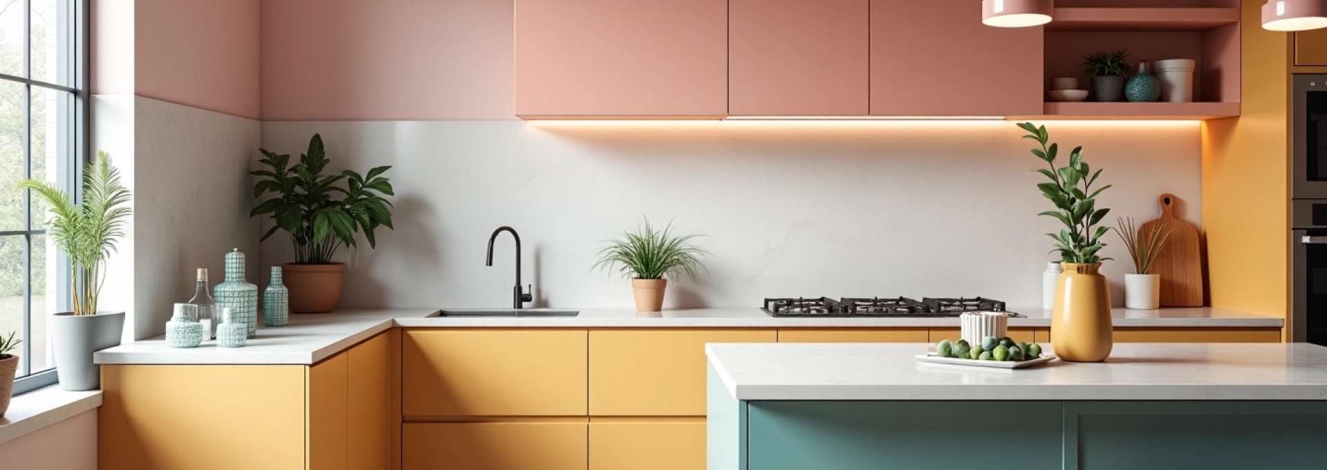 Ces teintes pastel fonctionnent particulièrement bien lorsqu’elles sont combinées avec des éléments blancs ou neutres. Vous pouvez utiliser ces couleurs sur les murs , les armoires ou même comme accents à travers des accessoires ou des textiles. L’avantage des pastels est leur polyvalence : ils peuvent être facilement mis à jour ou changés sans nécessiter une rénovation complète de la cuisine.